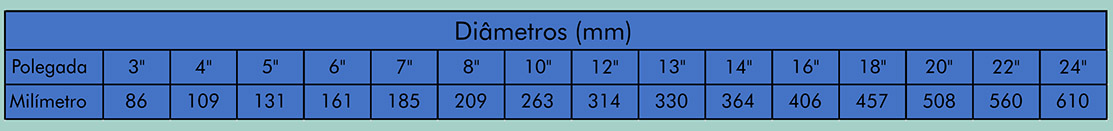 Diâmetros variados conforme tabela abaixo.