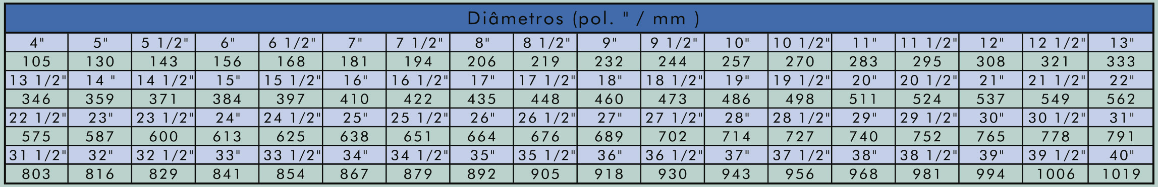 Variam de 4” (105 mm) a 40” (1019 mm)